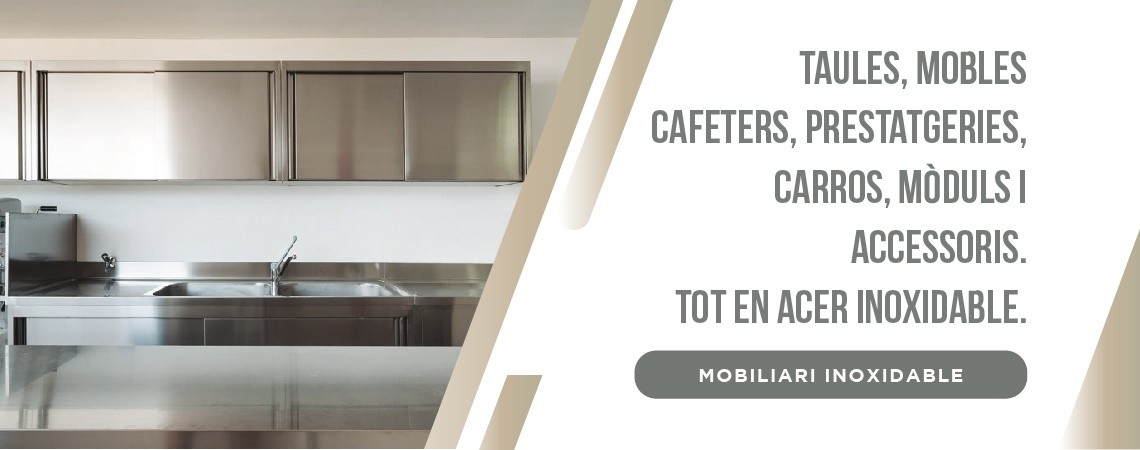 Taules de treball d’acer inoxidable, mobles cafeters, contramostradors, estants, piques i agüeres d’acer inoxidable, carros i armaris.