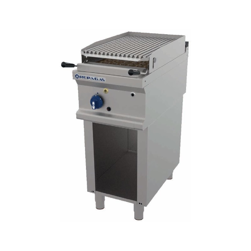 Barbacoa a gas, fabricada per Repagas, fons 75 PRO. Exterior construït en acer inox, acabat scotch. Gran disseny, funcionalitat, potència i accessibilitat. Cremadors tubulars d'acer inox. Taulell de 2 mm de gruix, graella construïda en acer inox, suporta altes temperatures i evita que es deformi, amb un disseny en forma de cunya per una millor recollida de greix i amb dues alçades. Transmissió de calor a través de l'ús de briquetes de ceràmica de grandària uniforme, reutilitzables i rentables. Peto posterior i lateral per evitar esquitxades. Aixetes de seguretat amb termoparell. Comandaments ergonòmics de poliamida +ABS resistents a la calor. Safata inferior i calaix recull-greixos frontal. Pilot d'encesa manual amb piezoelèctric. Rematades xemeneia d'acer inox. Superfície útil: 39 x 58 cm