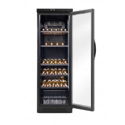 Expositor vertical de vi, vinoteca o cava, model UDCV 380. Acabat exterior en color negre. Llum vertical LED per millorar la visió dels productes. Termòstat digital amb un rang de temperatura de treball de +5ºC a +18ºC, apte tant per a vins blancs o rosats com per a vins negres. Capacitat en litres: 372 L. Capacitat en ampolles de 75 cl: 102 ampolles + 25. Refrigerant R600a. 5 prestatges de fusta inclosos (opcionalment se’n poden afegir més) i porta amb pany. NOMÉS DUES UNITATS A AQUEST PREU!