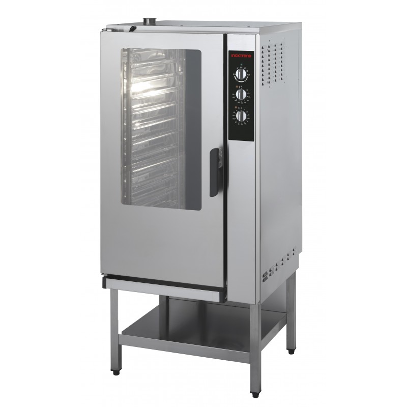 Forn mixt directe fabricat per Inoxtrend, model RDA 115 E de la Serie Simple, amb capacitat per a 15 safates GN 1/1, elèctric, mixte directe. Possibilitats de cocció: vapor, convecció i convecció + vapor. Amb selector de cicles. Llum interior. 1 graella en dotació. Entrada safates longitudinal. Distància entre guies 67 mm. Ideal espais reduïts.