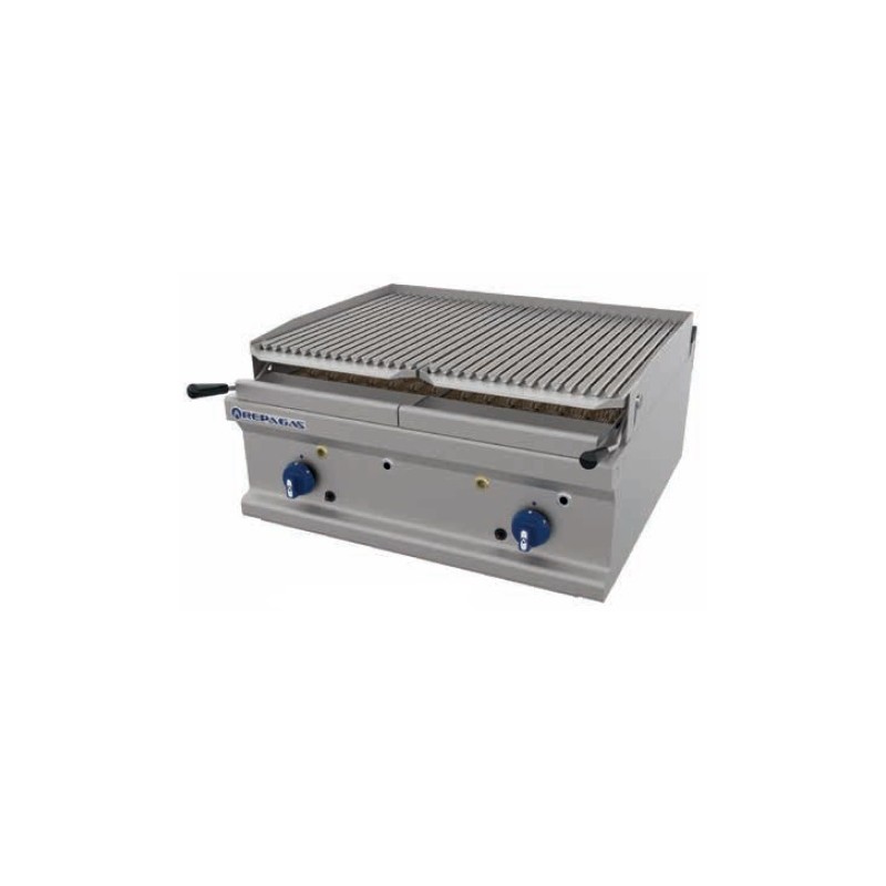 Barbacoa a gas, fabricada per Repagas, fons 75 PRO. Exterior construït en acer inox, acabat scotch. Gran disseny, funcionalitat, potència i accessibilitat. Cremadors tubulars d'acer inox. Taulell de 2 mm de gruix, graella construïda en acer inox, suporta altes temperatures i evita que es deformi, amb un disseny en forma de cunya per una millor recollida de greix i amb dues alçades. Transmissió de calor a través de l'ús de briquetes de ceràmica de grandària uniforme, reutilitzables i rentables. Peto posterior i lateral per evitar esquitxades. Aixetes de seguretat amb termoparell. Comandaments ergonòmics de poliamida +ABS resistents a la calor. Safata inferior i calaix recull-greixos frontal. Pilot d'encesa manual amb piezoelèctric. Rematades xemeneia d'acer inox. Superfície útil: 79 x 58 cm
