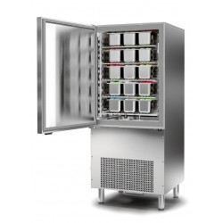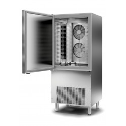 Abatidor Afinox Faster 10 E, nuevo modelo con panel táctil. Capacidad para 10 bandejas GN 1/1 o EN 60 x 40, y una producción de hasta 30 Kg/ ciclo en abatimiento positivo y 10 Kg/ ciclo en abatimiento negativo. Nuevo panel de control táctil y luminoso, muy intuitivo y fácil de usar. Display LED con mensajes con 9 idiomas. Alarmas audiovisuales. Aislamiento ecológico. Construcción en acero VAR-PET. El recubrimiento PET sobre acero es duradero, fácil de limpiar, anticorrosión y no deja huellas. Sonda al corazón incluida de serie. Equipamiento opcional: juego de guías para bandejas 60 X 40, filtro extraíble y puerta apertura contraria. Un imprescindible en cualquier cocina profesional con una nueva pantalla y la garantía y competitividad de Afinox.