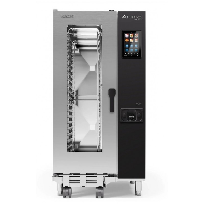 Horno Aroma Naboo de Lainox, eléctrico de carro con capacidad para 15 bandejas 60 x 40, con entrada longitudinal. Pantalla de 10” a todo color, con programas con hasta 15 fases, 6 velocidades de ventilación, y todos los sistemas patentados por Lainox: ICS (Interactive Cooking System), JIT (Just in Time), Multilevel, Auto Clima, Fast-Dry Boosted, Cocción nocturna, VCS (vapor Cleaning System), WMS (Wash Management System, etc. Alcanza los 320 ºC en cámara, el horno que alcanza más temperatura del mercado. Conexión a Nabook, la app de Naboo que te permite control del equipo a distancia, control de consumos, editar recetas, listado de alérgenos por recetas, y hasta calcular el coste de cada plato, ración, menú, etc. Consúltanos los opcionales y accesorios disponibles.